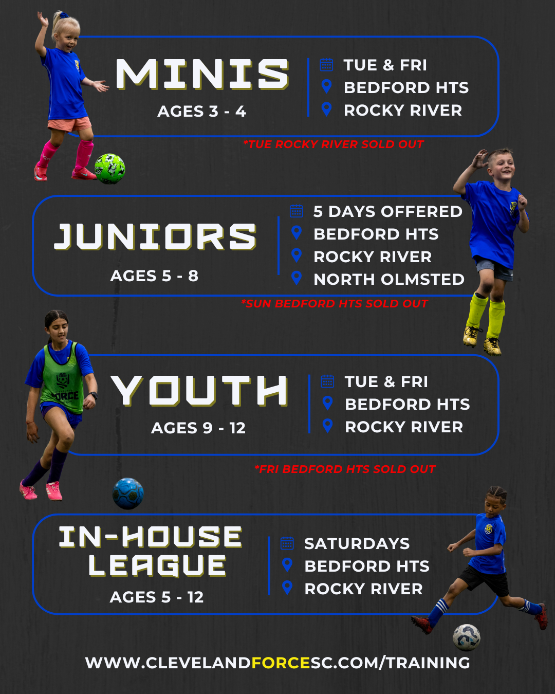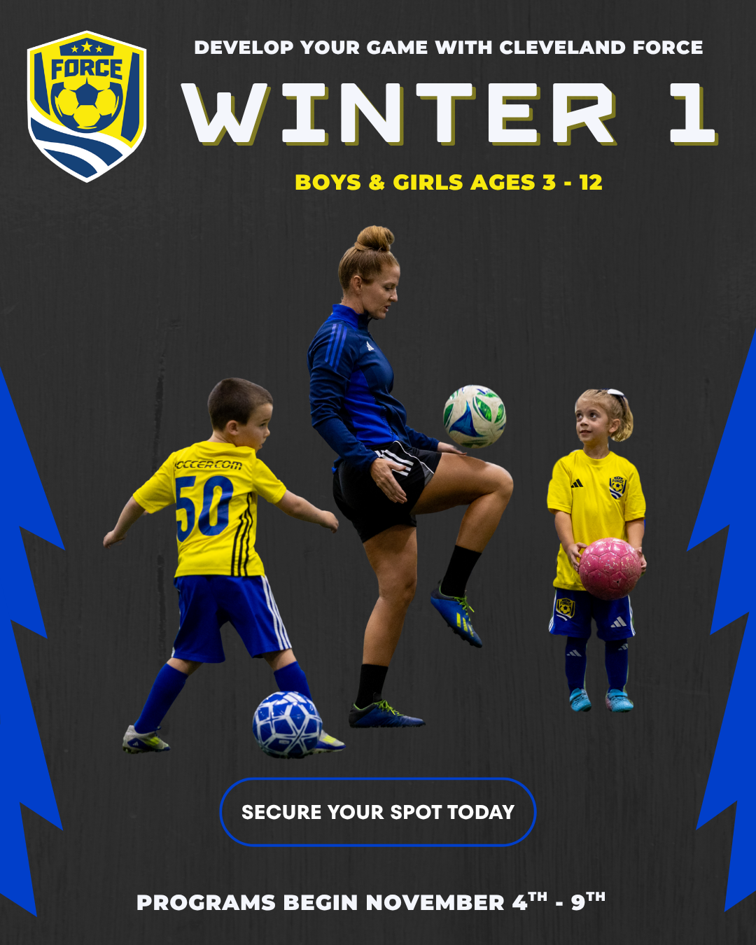 Develop your game this winter with Cleveland Force SC! Our training programs focus on the foundation stage of youth soccer, helping players build skills, confidence, and a love for the game. With flexible training options and convenient locations across Northeast Ohio, there’s a perfect fit for every player ages 3–12!