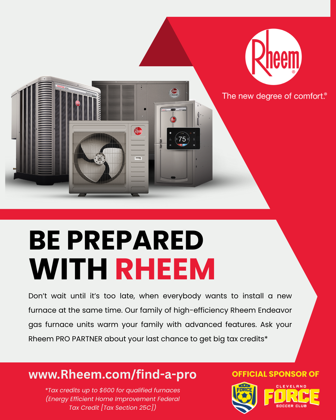 Cleveland Force SC is proud to have Rheem as our front of jersey sponsor for the 2025-26 season! Now that fall weather has arrived, you can trust Rheem's high-performing products that are engineered for reliability!