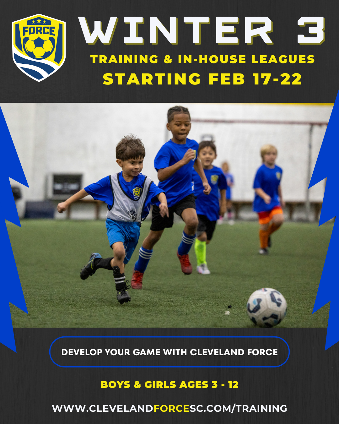 Develop your game this winter with Cleveland Force SC! Our training programs focus on the foundation stage of youth soccer, helping players build skills, confidence, and a love for the game. With flexible training options and convenient locations across Northeast Ohio, there’s a perfect fit for every player ages 3–12!