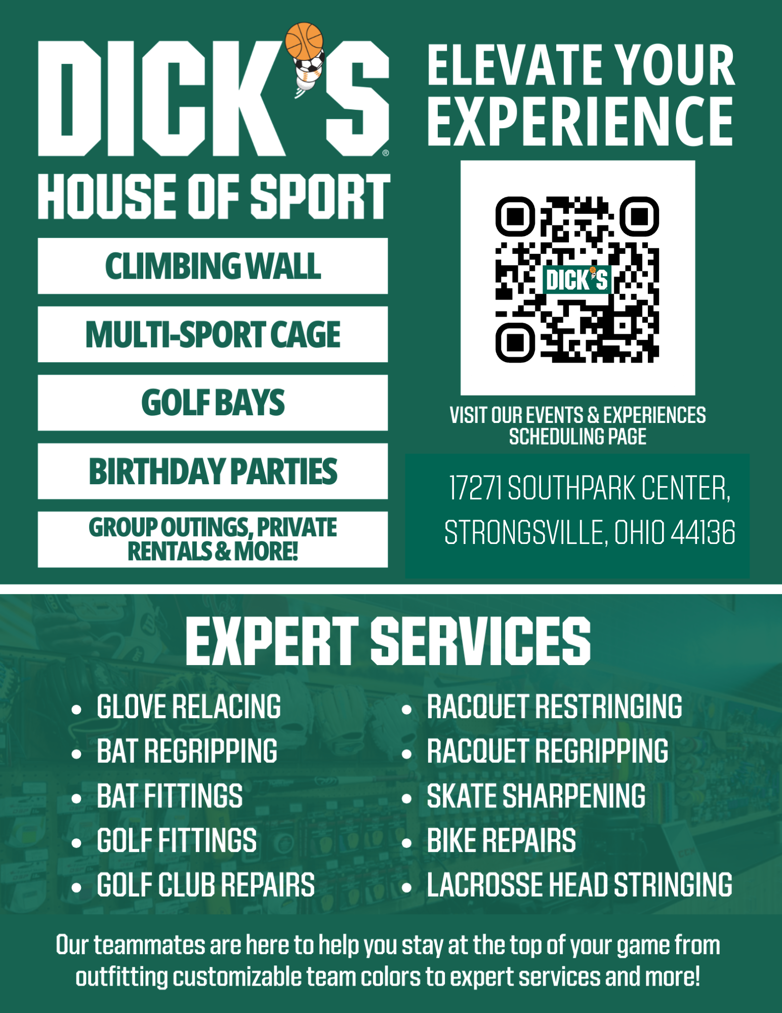Check out DICK’S House of Sport Strongsville at SouthPark Mall! DICK’S House of Sport is your destination for sport. Find top gear to perform your best, practice your skills, connect with your community, and attend special events in the new interactive space.