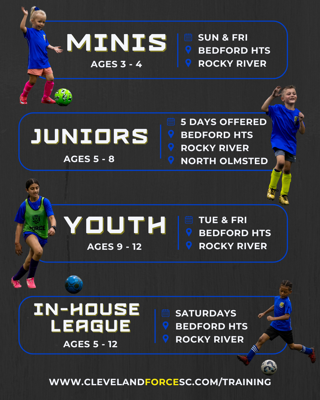 275 players, aged 5-12, within the Cleveland Force In-house leagues. These leagues are designed to offer an environment where players can gain initial exposure to the sport. All games are coached weekly by members of the Academy staff.