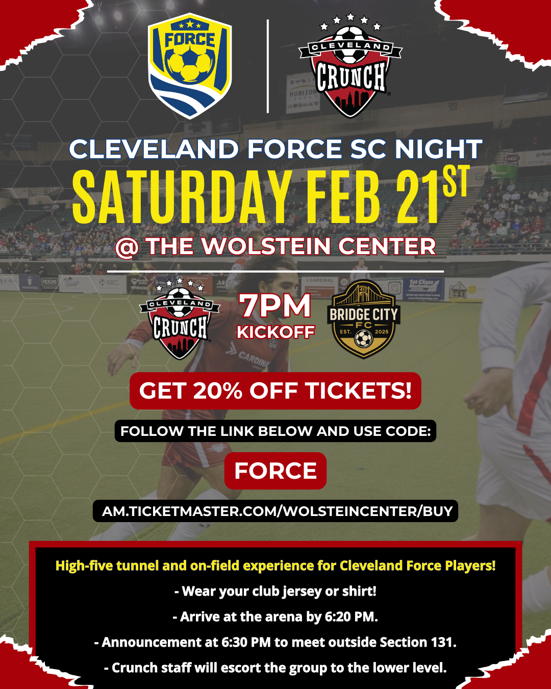 Cleveland Force SC players will be invited to join in on the pre-game high‑five tunnel and on‑field experience! For players to participate, please wear your Force gear and arrive at the arena by 6:20 PM. An announcement will be made at 6:30 PM to meet outside Section 131 where a Crunch staff member will escort the group to the lower level!