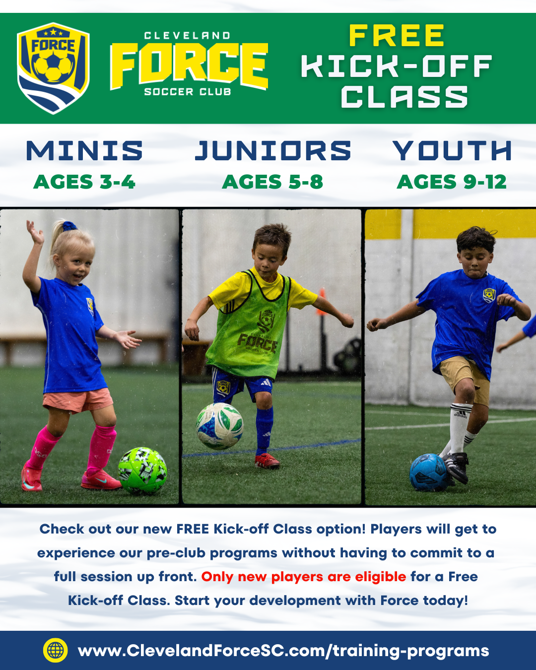 Check out our new FREE Kick-off Class option! Players will get to experience our pre-club programs without having to commit to a full session up front. Only new players are eligible for a free Kick-off Class.